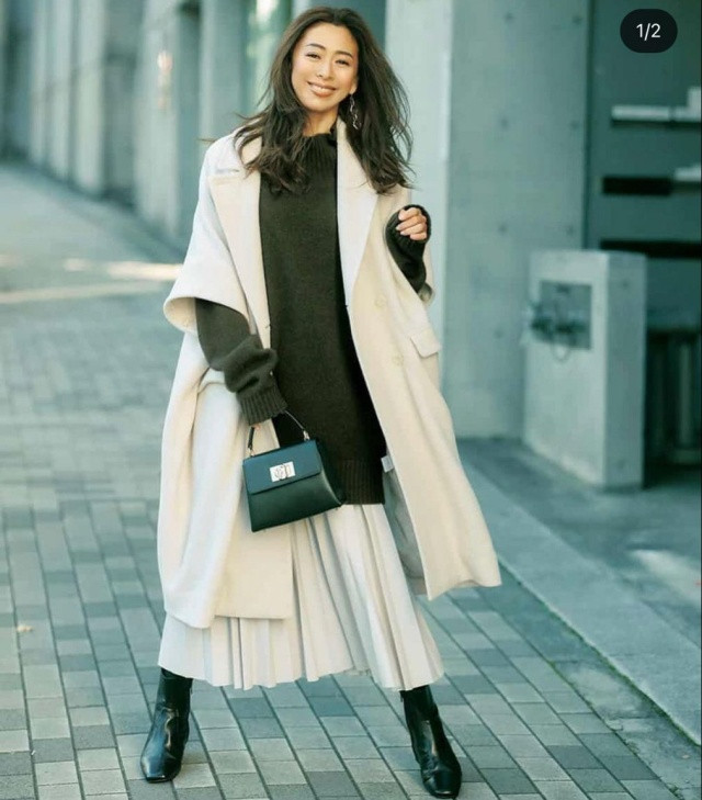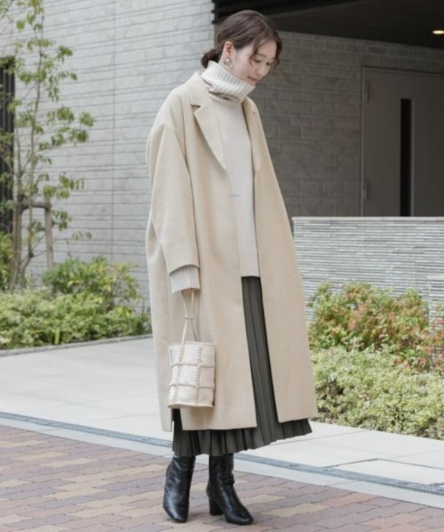 米白色长款宽松大衣,慵懒的版型自带流动氛围感;内搭选拔深色高领毛衣,与下装米白色百褶长裙造成“浅深撞色+同色系呼应”的组合,既通过深色毛衣增多了视觉要点,又靠长裙与大衣的同色衔尾让造型更调和温情。
