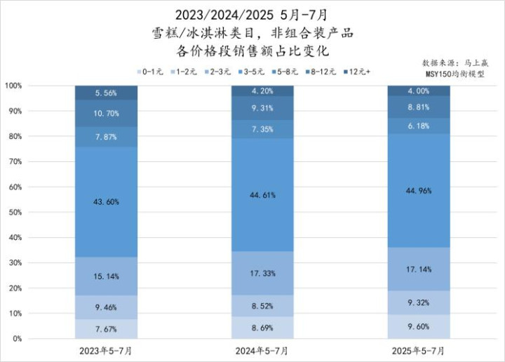 何况从2023—2025年每年5—7月的监测数据来看,0—1元价钱带的销售额占比在逐年高潮;2—3元和3—5元价钱带是最主流遴荐,销售额占比一直自由;而8—12元及12元+价钱带销售额占比则在握续松开。